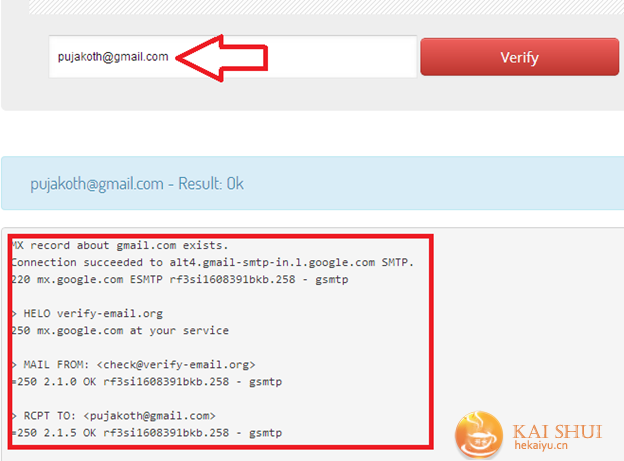 现在我们拥有受害者的名字并已知他使用电子邮件,我们可以看到“p”和“h”之间的六颗星号,我们可以使用像http://verify-email.org的这种服务来验证邮箱地址可不可能是pujaKoth@gmail.com。
